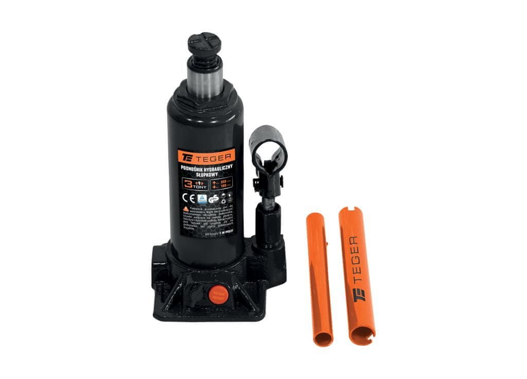 TEGER 3T hidravlična dvigalka. Profesionalna dvigalka za univerzalno uporabo v avtomobilskih in kmetijskih delavnicah, domačih garažah, servisih za vozila in vulkanizerjih. Odlikuje ga natančna nastavitev višine zahvaljujoč dodatno odstranljivemu zatiču. Tlačni varnostni ventil ščiti pred preobremenitvijo, dolg hod cilindra pa poveča učinkovitost. Izdelan iz visokokakovostnega jekla zagotavlja ustrezno togost in vzdržljivost, njegova preprosta in robustna zasnova pa povečuje zanesljivost. Njegova majhnost zagotavlja enostavno uporabo in visoko mobilnost. Idealen za kmete, priročen kovček omogoča udoben transport na stroju. Stabilna, vzdržljiva in varna konstrukcija je v skladu z evropskimi standardi CE in ima certifikat TÜV Rheinland in GS.