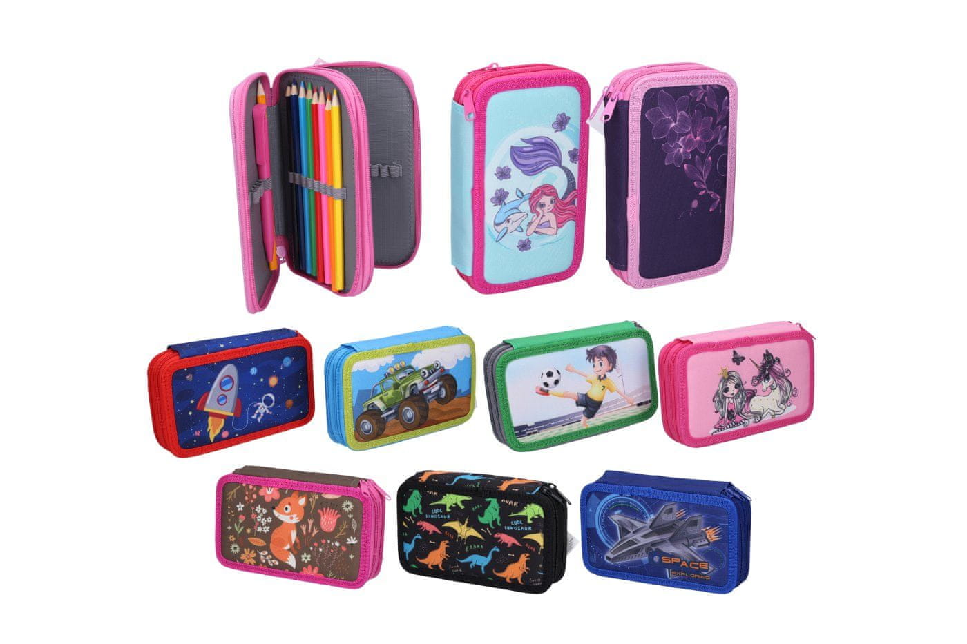 Dvonadstropni svinčnik z opremo je namenjen osnovnošolcem. Vsak posamezen polička se zapira z ločeno zadrgo. Kovček ima prilagodljive gumijaste zanke za shranjevanje pisalnih pripomočkov.
