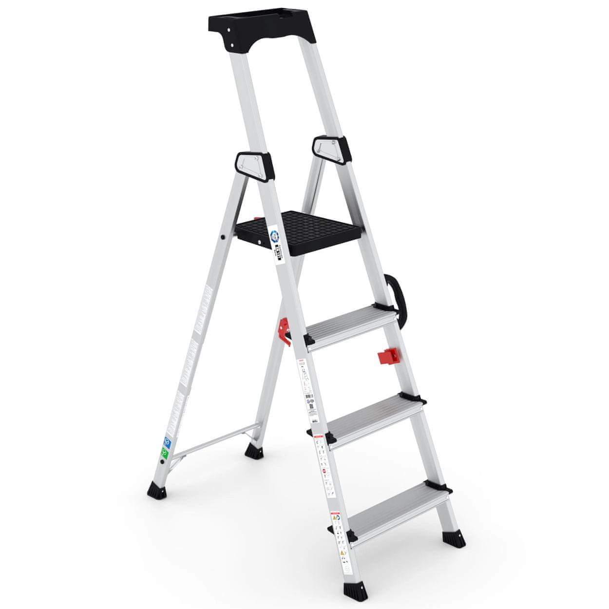 - Pladenj za orodje: premišljen pladenj za orodje na vrhu lestve nudi praktično rešitev za organiziranje in dostop do vaših orodij, kar poveča učinkovitost in prihrani čas.