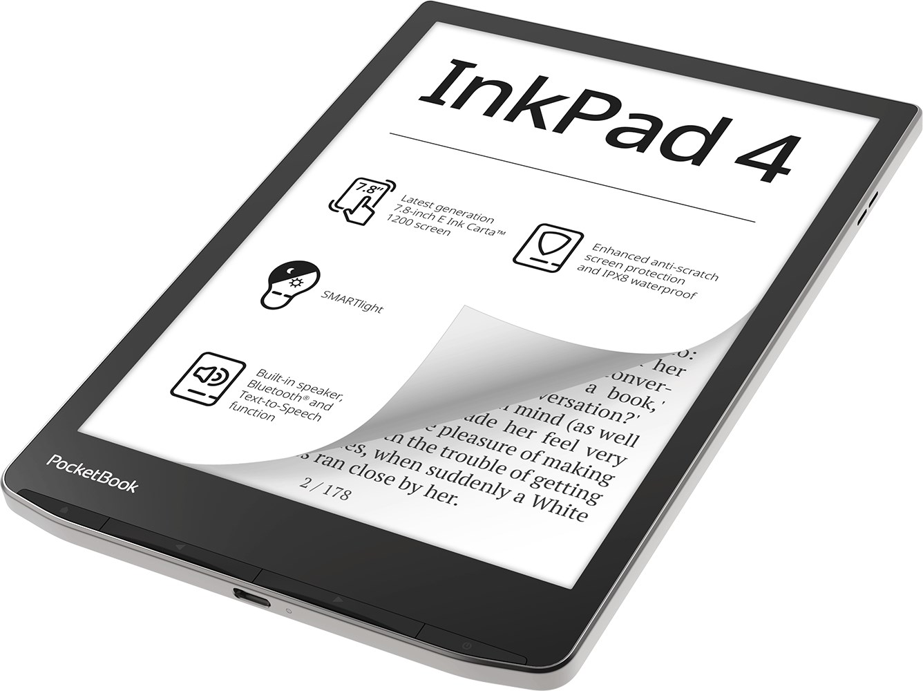 E-bralnik PocketBook InkPad 4 Ustvarjen z mislijo na zahtevne bralce. Večja baterija, boljša podpora za zvočne datoteke, vgrajeni zvočniki in povezava Bluetooth, več notranjega pomnilnika in podpora za zunanje medije zahvaljujoč USB-C s funkcijo OTG. In to še ni vse! Spoznajte novo, izboljšano različico e-bralnika PocketBook InkPad 4!