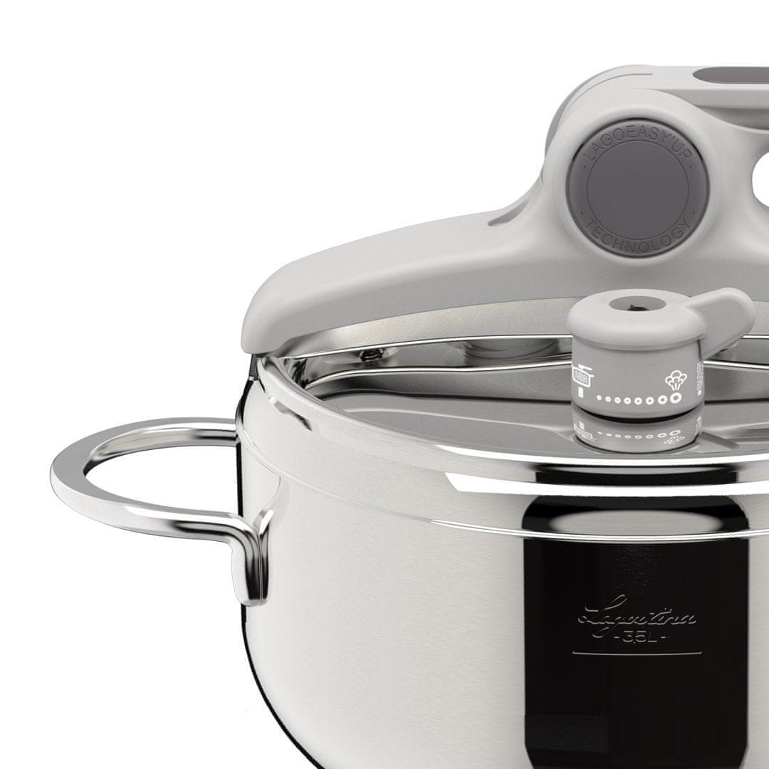 Ekonom oz. lonec na pritisk DELIZIOSA s prostornino 3,5 l, predstavlja inovacijo brez primere zahvaljujoč ekskluzivni tehnologiji LagoEasy'Up®- novemu patentiranemu sistemu odpiranja, ki ga je enostavno odpreti z eno roko in z enim gibom. Lonec na pritisk je vsestranski pripomoček, saj omogoča kuhanje na pari, hitro kuhanje in popekanje; je zdravo, saj kuhanje v ekonomu ohrani do 35 % več vitaminov in mineralnih soli; je hiter, saj skrajša čas kuhanja do 50 %. Opremljen je s 6 varnostnimi sistemi in regulacijskim ventilom: zavrtite ga skupaj z ročico za neposredno upravljanje navpičnega izpusta pare. 3-slojno dno IRRADIAL® PLUS je primerno za vse kuhalne plošče, vključno z indukcijo, saj omogoča popolno razpršitev toplote. Primeren je za pomivanje v pomivalnem stroju (brez pokrova).