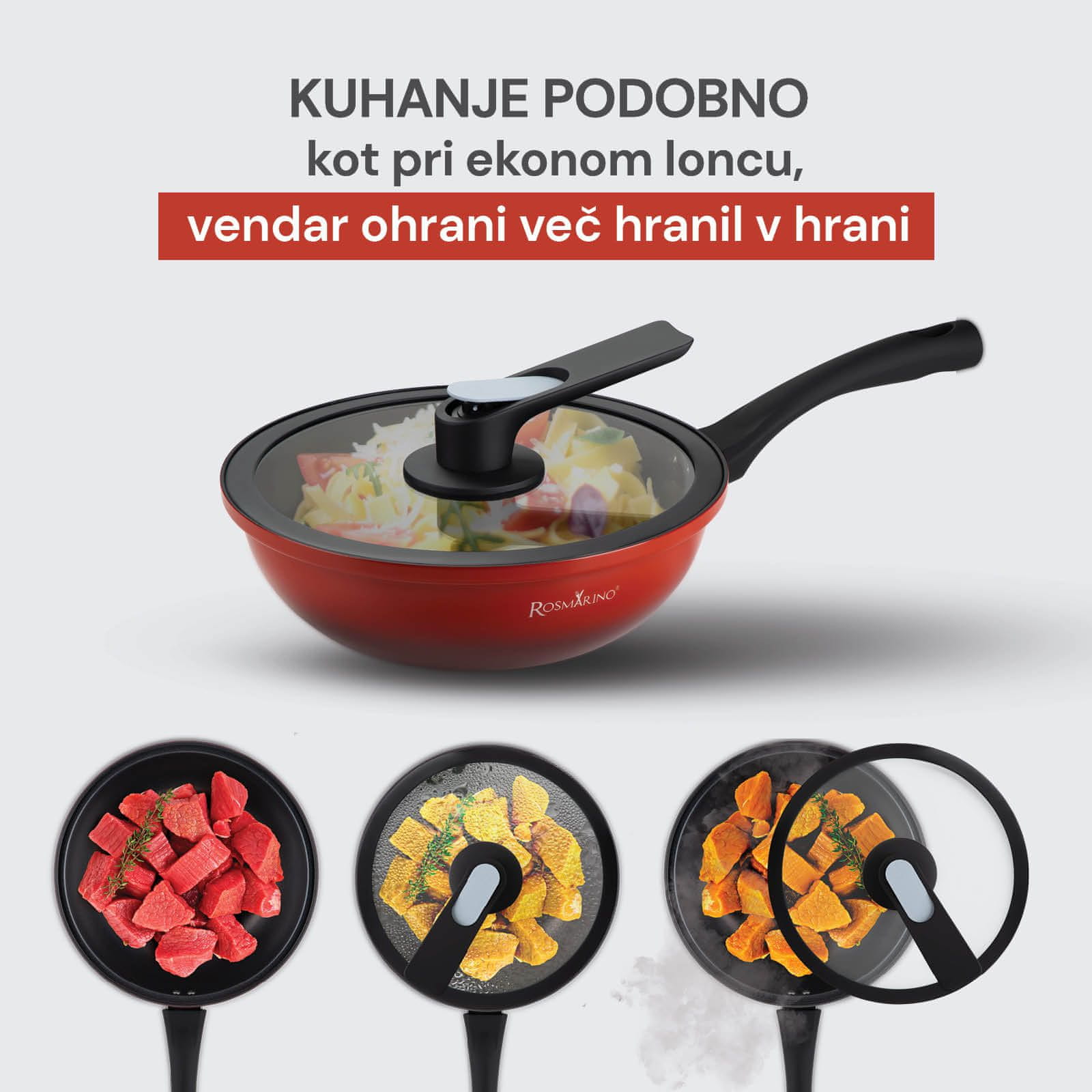 Vok Rosmarino Fresh Cooker je pametna rešitev, zasnovana za izjemno hitro in varčno pripravo obrokov. S kuhanjem pod tlakom prepolovi čas kuhanja za kar 50 % in pri tem prihrani do 70 % energije v primerjavi z navadnimi lonci. Jedro voka je izdelano iz visokoprevodnega aluminija, kar omogoča hitro in enakomerno segrevanje.