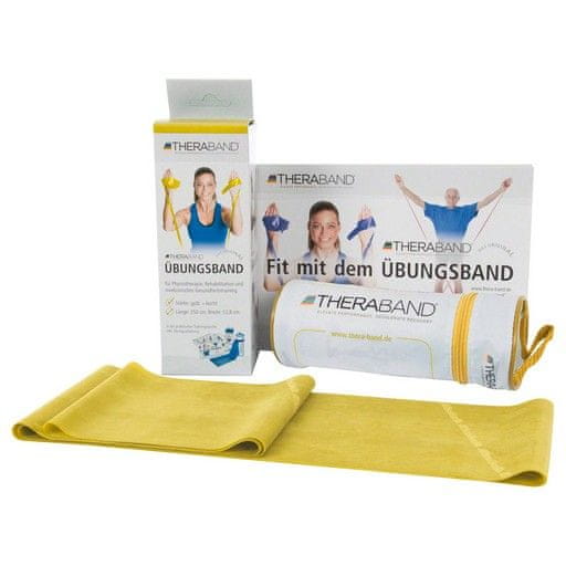 Originalni elastični trakovi za vadbo Thera-Band v rumeni barvi, ki označuje majhno obremenitev. Standardno pakiranje: 2,5 m x 13,8 cm.