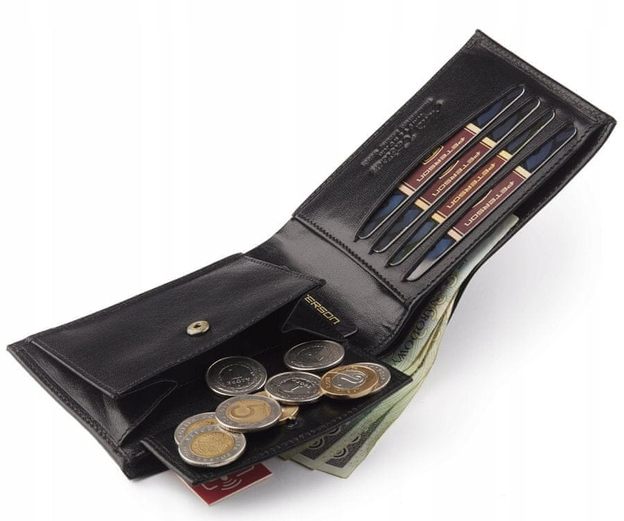 Dvodelna črna denarnica iz naravnega usnja + etui PetersonDenarnica ima posebno podlogo iz prevlečenih mikrovlaken, opremljena s tehnologijo RFID BLOCKING SYSTEM (radiofrekvenčna identifikacija). Ščiti proximity kartice, biometrične dokumente, osebne izkaznice in kartice javnega prevoza pred nepoob Celoten opis