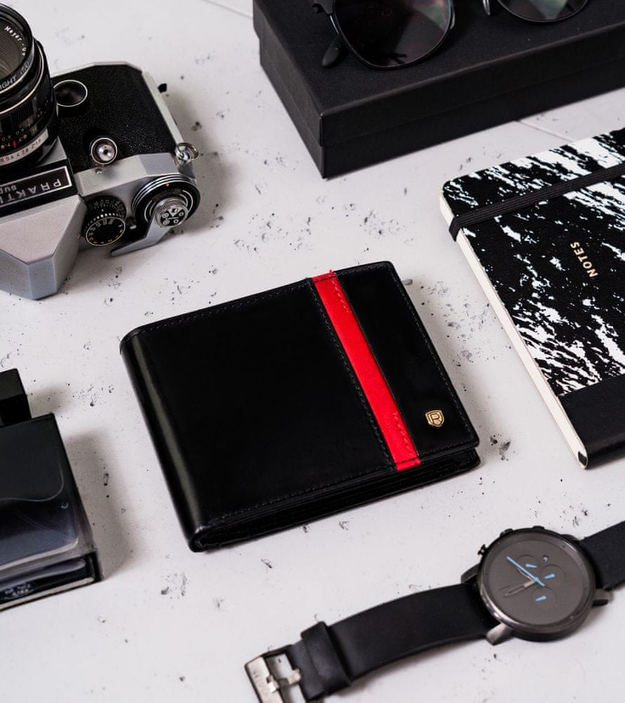 Moška usnjena denarnica z rdečim paščkom Celoten opis