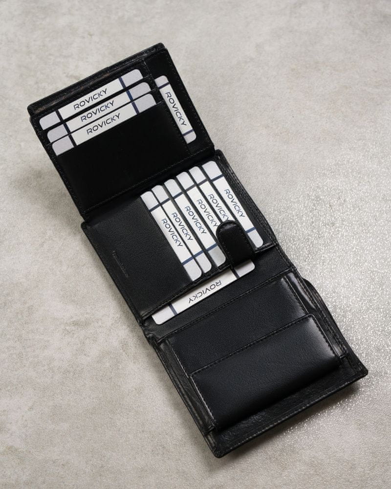 Usnjena moška denarnica za kartice RovickyUgledna blagovna znamka | Izdelek znane in cenjene poljske znamke z dolgoletno tradicijo.Elegantna izdelava | Denarnica je izdelana iz kakovostnega naravnega usnja v modni in klasični črni barvi.Vedno moden dizajn | Denarnica v klasičnem stilu. Model v navpi Celoten opis