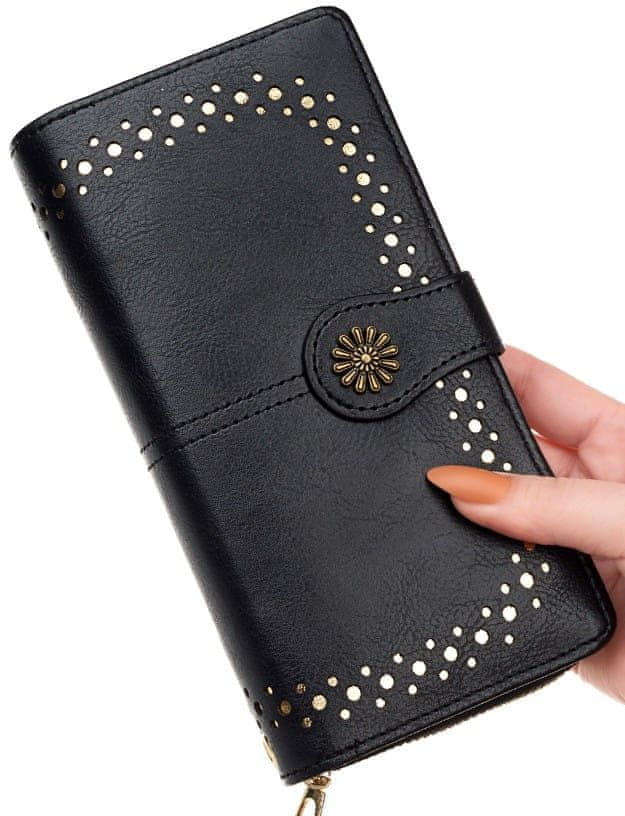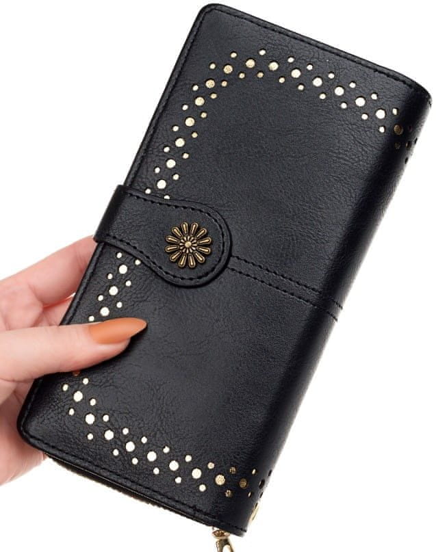 Elegantna ženska denarnica izstopa s svojim sofisticiranim dizajnom in kakovostno obdelavo, kar jo dela popoln dodatek za vašo torbico ali odlično darilo za nekoga posebnega.