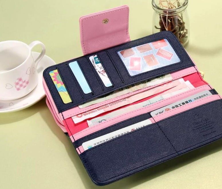 Notranja razporeditev denarnice vključuje 19 različnih predelkov in žepov, ki sprejmejo do 11 plačilnih kartic ali dokumentov, fotografij bližnjih, pet velikih dokumentov, dva ravna telefona ali pakete bankovcev. Ne manjka niti velik žep za kovance z zadrgo in posebna žepe za telefone kot sta iPhone 4/5 ali Samsung Galaxy S2/S3/S4. Ta eleganten dodatek je odlična darila za vsako priložnost in odlično dopolni vašo torbico.