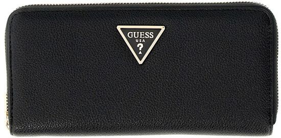 Elegantna ženska denarnica Guess v črni barvi. Gladka površina z drobno strukturo in kovinskim logotipom na sprednji strani. Celoten opis