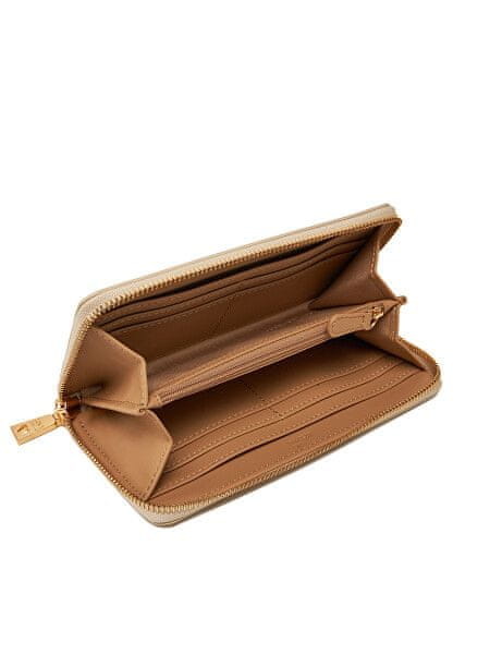 Prefinjena ženska denarnica v nežni bež barvi, ki je videti brezčasna in elegantna. Sprednji del je okrašen z značilnim logotipom v zlati kovini. Celoten opis
