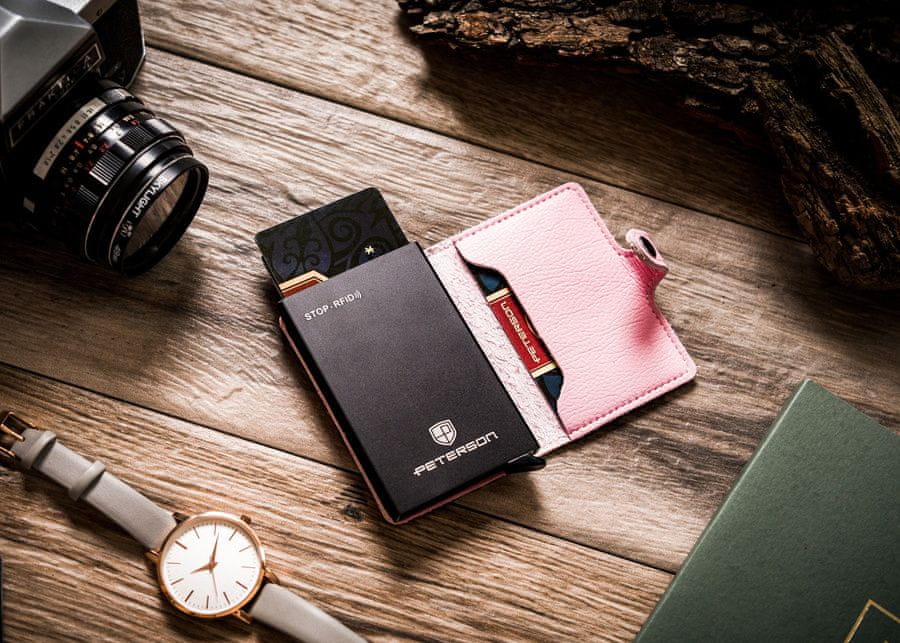 Denarnica, opremljena z zaščitna torbica za kartice z inteligentnim sistemom za enostavno odstranjevanje kartic- samo potegnite majhno ročico in kartice takoj zdrsnejo ven. Izdelano iz aluminija, ščiti kartice pred upogibanjem, zlomom in neželenimi brezstičnimi transakcijami
