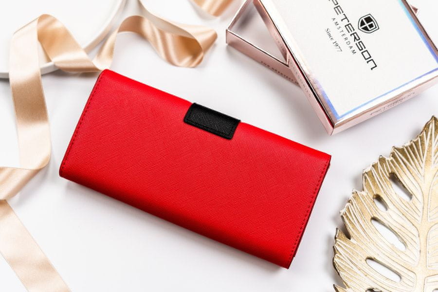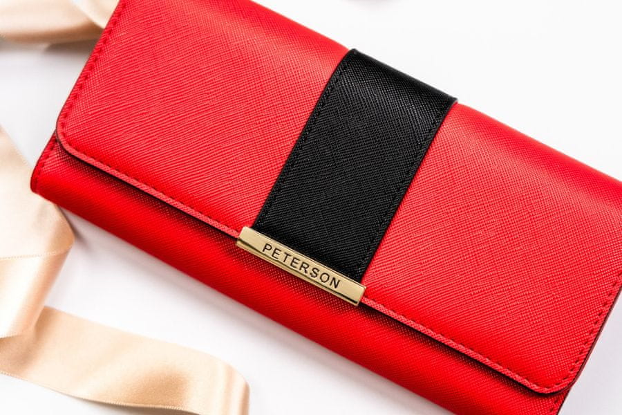 Velika ležeča ženska denarnica iz ekološkega usnja PetersonVisoka kakovost izdelave | Izekološkega usnja. Vsa kovinska oprema, vključno z elegantnim logotipom na sprednji strani, je zlate barve Celoten opis