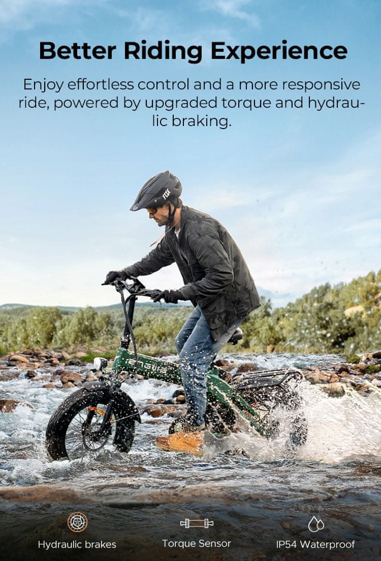 Varnostne lastnosti za zaščitoHidravlične disk zavore s premerom 180 mm zagotavljajo zanesljivo zaviranje. Široke pnevmatike 20*4.0 in prednje vzmetenje izboljšajo varnost in udobje.