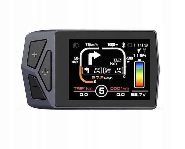 Priložena litij-ionska baterija s kapaciteto 16 Ah vam omogoča, da prevozite od 80 do celo 160 km z enim polnjenjem. Baterija je nameščena v posebnem ohišju, ki jo ne le ščiti pred zunanjimi dejavniki ali nenamernimi poškodbami, temveč omogoča tudi hitro namestitev na kolo. Baterijo preprosto potisnite v vodilo, ki je bilo predhodno nameščeno v okvirju. Baterija ima tudi vrata USB, ki jih lahko uporabite za polnjenje pametnega telefona ali drugih naprav. LCD (neobvezno) Z enostavnim LCD-zaslonom lahko izvajate potrebne nastavitve, konfigurirate pomoč in največjo hitrost ter predvsem nenehno spremljate stanje baterije. Inteligentni sistem spremlja vaš slog vožnje in prikazuje raven baterije sorazmerno s porabljeno močjo. TIP 1 (EKD01) Stranski zaslon z nekaj izboljšanimi funkcijami in funkcijo Bluetooth Količina PAS: 5. 3. 2009