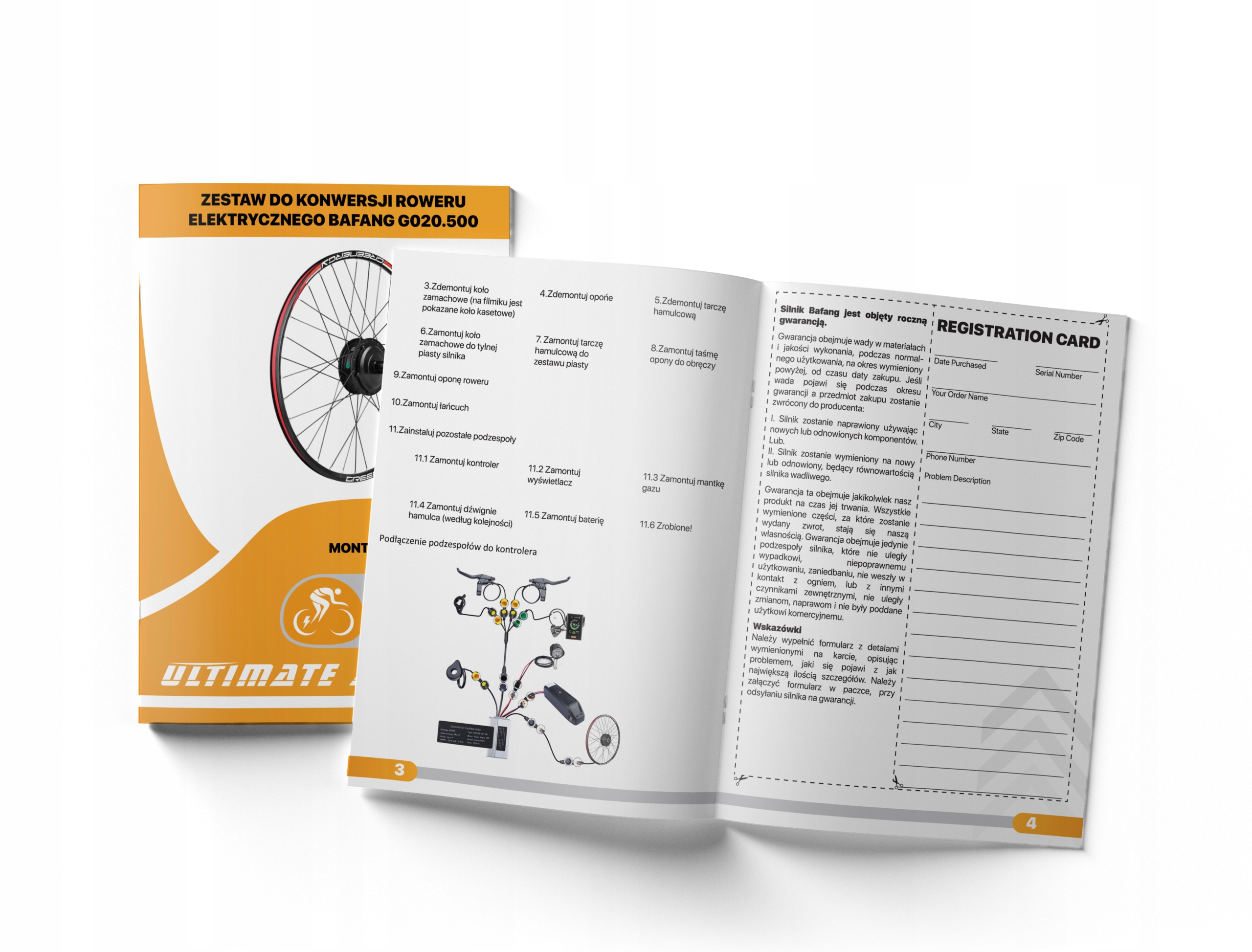Komplet vsebuje navodila za uporabo, ki vsebujejo glavne informacije o pravilni uporabi, delovanju in namestitvi električnega kompleta Bafang, zaslona in dodatnih delov.