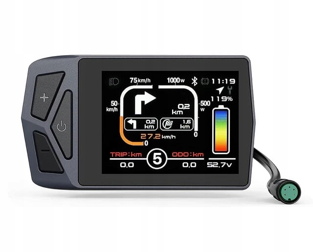 Priložena litij-ionska baterija s kapaciteto 13 Ah vam omogoča, da z enim polnjenjem prevozite od 35 do celo 60 km . Baterija je nameščena v posebnem ohišju, ki jo ne le ščiti pred zunanjimi dejavniki ali nenamernimi poškodbami, temveč omogoča tudi hitro namestitev na kolo. Baterijo preprosto potisnite v vodilo, ki je bilo predhodno nameščeno v okvirju. Baterija ima tudi vrata USB, ki jih lahko uporabite za polnjenje pametnega telefona ali drugih naprav. LCD (neobvezno) Z enostavnim LCD-zaslonom lahko izvajate potrebne nastavitve, konfigurirate pomoč in največjo hitrost ter predvsem nenehno spremljate stanje baterije. Inteligentni sistem spremlja vaš slog vožnje in prikazuje raven napolnjenosti baterije sorazmerno s porabljeno močjo. TIP 1 LCD z velikim zaslonom, nameščen centralno na krmilu. TIP 2 Kompakten zaslon s priročno montažo in vrati USB.
