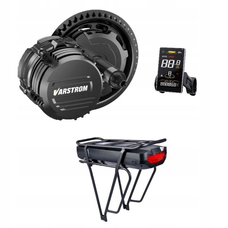 Litij-ionska baterija, ki je priložena kompletu, zagotavlja odlično zmogljivost, doseg in visoko vzdržljivost. Baterija je nameščena v posebnem ohišju, ki jo ne le ščiti pred zunanjimi dejavniki ali nenamernimi poškodbami, temveč omogoča tudi hitro namestitev na kolo . Baterija je opremljena tudi z USB , ki ga lahko uporabite za polnjenje pametnega telefona ali drugih naprav.