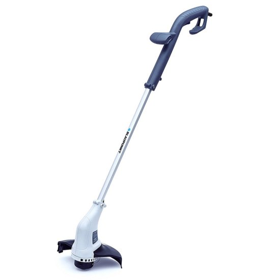 Električna kosilnica z močjo 250 W, opremljena s polavtomatskim podajalnikom niti in ergonomskim dodatnim ročajem.