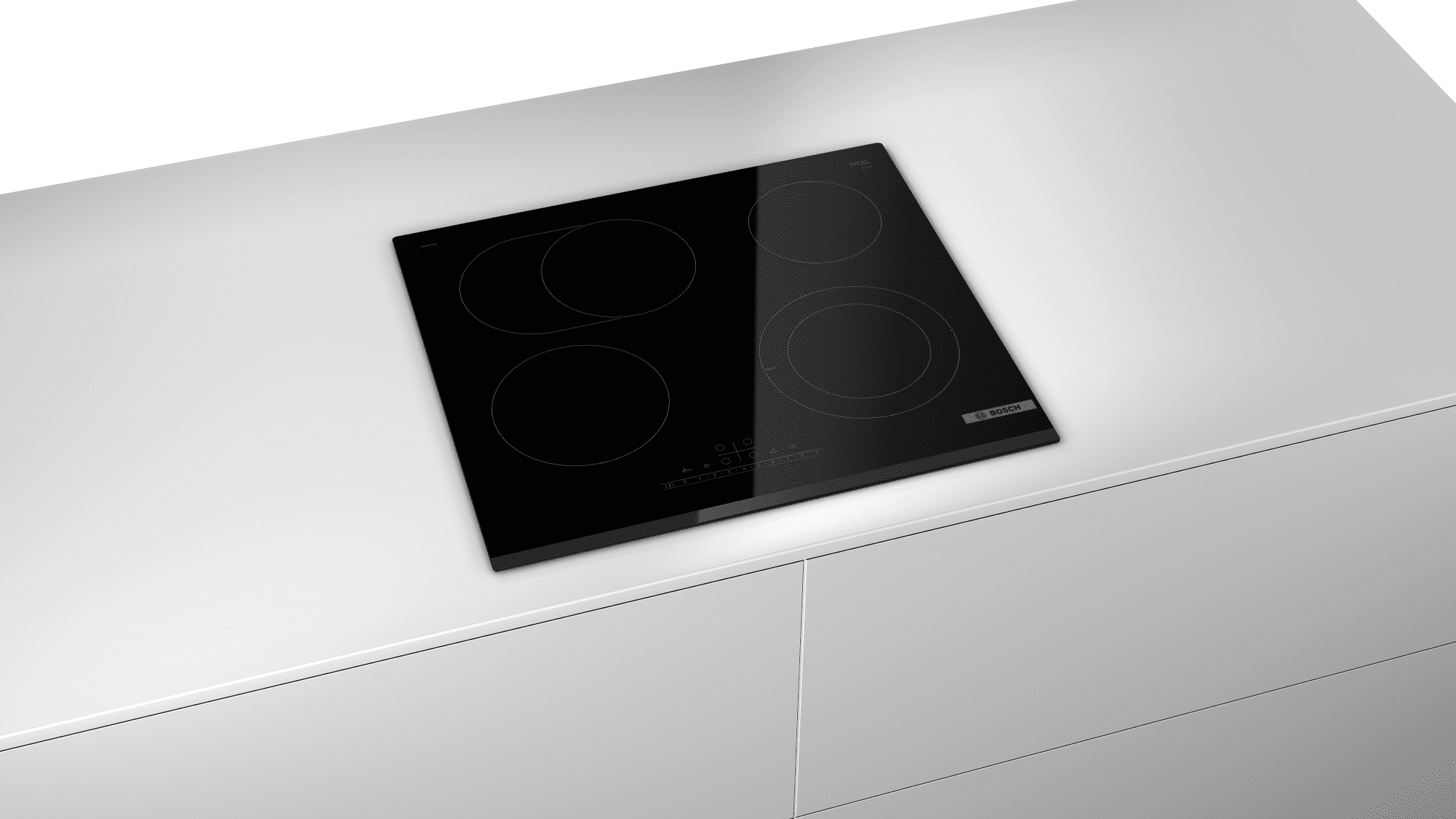 ** Električna steklokeramična** kuhalna plošča Bosch PKN631FP2E, shrani vse nastavljene nastavitve. Ponuja štiri kuhališča z upravljalno ploščo na sredini ter neverjetno izbiro med 17 različnimi stopnjami za nastavitev kuhališč. Z regulacijo moči, kontrolirate moč posamezne kuhalne plošče.