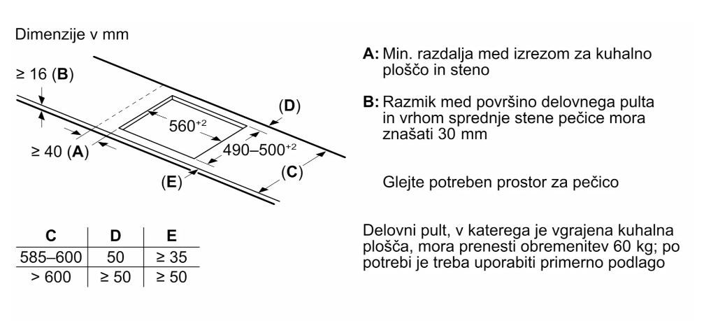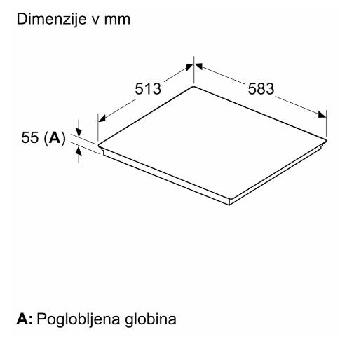 | Fizične lastnosti | Dimenzije (V x Š x G): 55 × 583 × 513 mm Dimenzije niše (V x Š x G): 55 × 560 x (490 – 500) mm Min. debelina delovne površine: 16 mm Dolžina priključnega kabla: 100 cm Tip vtiča: brez vtiča (električni priključek opravi električar) Barva: črna |