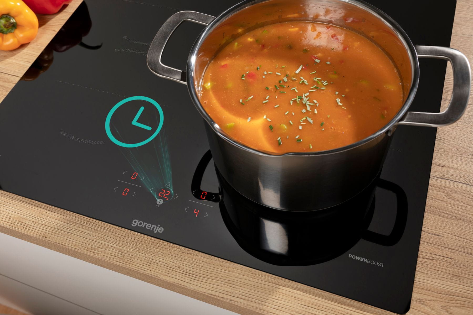 S funkcijo časovnika lahko izbirate čas in moč kuhanja za vsako kuhalno cono posebej, funkcija PowerBoost pa omogoča delovanje s povečano močjo in občutno skrajša čas segrevanja do zavretja vode. Večje območje BigZone za večje ponve in posode se nahaja spredaj, manjše pa zadaj.