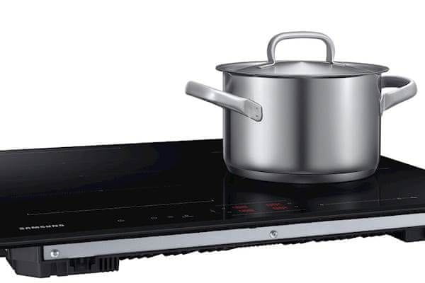 Indukcijska kuhalna plošča s štirimi območji nudi enostavno upravljanje na dotik z otroškim varnostnim zaklepanjem. Ponaša se s posebnim širokim območjem Flex Zone Plus, ki nudi visoko mero fleksibilnosti za uporabo kuhinjske posode različnih velikosti, vključno z velikimi in podolgovatimi lonci. Zagotavlja enakomerno kuhanje z manj mrtvimi točkami od običajnih kuhališč. Vsako Flex Zone Plus območje lahko sprejme do 38 × 21 cm kuhinjske posode. Najmanjši premer posode, ki ga kuhališče še zazna meri 14 cm.
