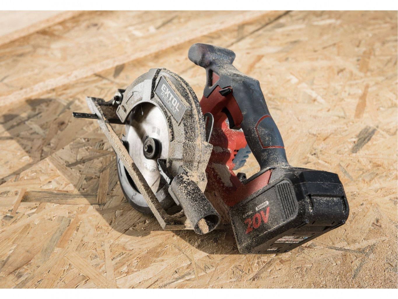 Akumulatorska krožna žaga je zasnovana tako, da uporabnikom omogoča zmogljivo in enostavno rezanje pri različnih vodovodnih, električnih, okvirnih, zaključnih in tesarskih delih. Žago poganja zmogljiv motor s 3650/min, ki uporabnikom omogoča hitro in enostavno rezanje trdih materialov. Zgornja in spodnja kovinska zaščita odlično ščitita rezilo v primeru padca. Gumijast ročaj z mehkim oprijemom je ergonomsko oblikovan tako, da uporabnikom zagotavlja odlično udobje in ravnotežje ter omogoča enostavno rokovanje z rezilom. Za običajno delo zadostujeta ena ali dve 2000mAh bateriji, ki ju lahko hitro napolnite s hitrim polnilnikom, za zahtevnejše ali daljše delo pa priporočamo večje baterije s kapaciteto 4000–8000 mAh. Baterijo lahko uporabljate v vseh vrstah orodij EXTOL SHARE20V. Zaradi uporabljene litij-ionske tehnologije ga je mogoče kadar koli znova napolniti, ne da bi se zmanjšala njegova zmogljivost. Li-ionska baterija zelo počasi izgublja energijo zaradi samopraznjenja, zato je dolgo časa napolnjena in pripravljena za uporabo.