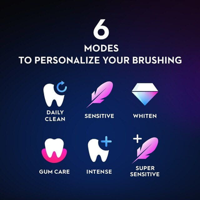 - 6 načinov čiščenja – Daily Clean, Whitening, Gum Care, Sensitive, Intense, and Super Sensitive