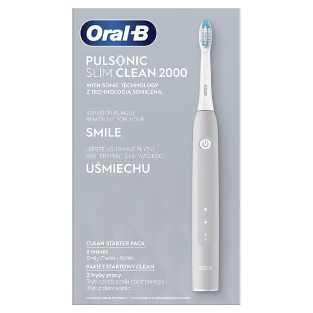 Nežna sonična tehnologija odstranjuje več zobnih oblog kot klasična zobna ščetka Oral-B Slim Clean 2000 Grey sonična električna zobna ščetka ponuja nežno sonično tehnologijo, ki pomaga odstranjevati površinske madeže in obarvanje na zobeh. Izbirate lahko med 2 načinoma in uporabo praktičnega časovnika. Celoten opis