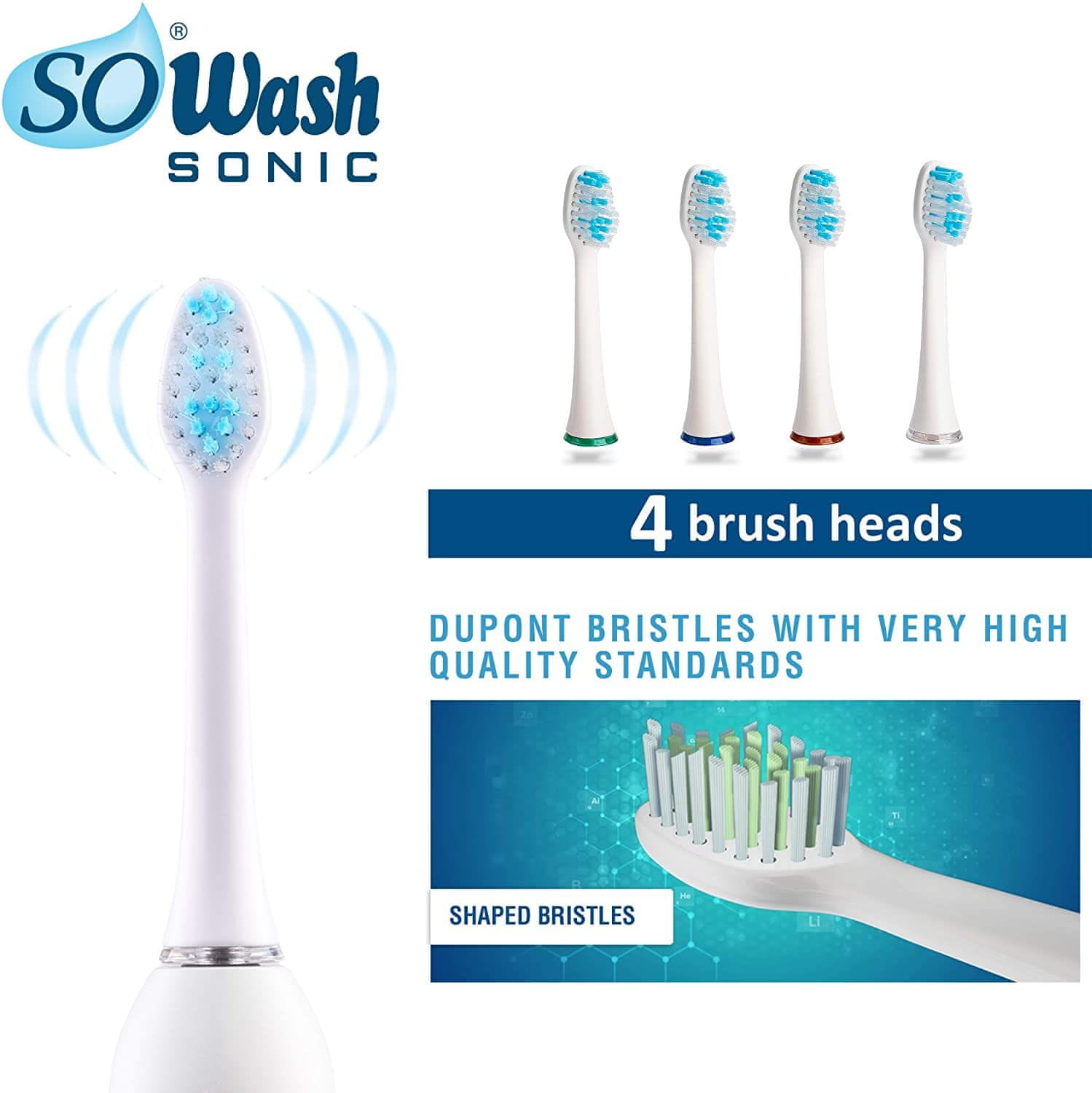 SOWash Sonic dodatne zobne ščetke imajo obliko ščetin, ki omogočajo optimalno čiščenje med zobmi in vzdolž žlebov dlesni. Paket vsebuje 4 glave električnih zobnih ščetk SOWash z srednje trdimi ščetinami in barvnimi podložkami, za lažjo označevanje uporabnika.