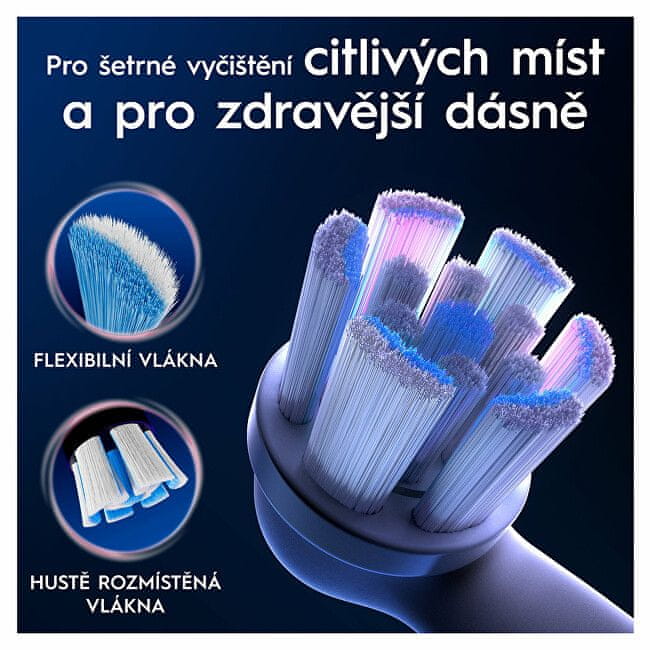 Glave ščetk Oral-B iO Gentle Care so bile zasnovane za nežno, vendar maksimalno učinkovito ustno nego. Združujejo do 4.000 izjemno tankih ščetin s prilagodljivim zunanjim obročem, ki se popolnoma prilagaja obliki vaših zob in hkrati ščiti dlesni. Edinstvena okrogla glava, ki jo je navdihnilo orodje profesionalnih zobozdravnikov, zagotavlja profesionalno vsakodnevno čiščenje, tudi za tiste z občutljivimi zobmi ali nagnjene h krvavitvi dlesni. Združljiva izključno z zobnimi ščetkami Oral-B iO.
