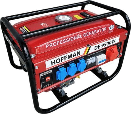 Hoffman DE 9500W agregat poganja zračno hlajen 4-taktni motor z nazivno hitrost 3600 obratov na minuto. Za zagotavljanje stabilne izhodne napetosti skrbi funkcija AVR – samodejni regulator napetosti. Zažene se enostavno z ročnim zagonom. Rezervoar za gorivo ima kapaciteto 15 litrov, olje pa 0,5 litra, kar omogoča dolgo delovanje brez prekinitev. Poraba goriva znaša 0,5 litra na uro pri 50% obremenitvi, pri čemer deluje tiho z glasnostjo približno 65 dB.