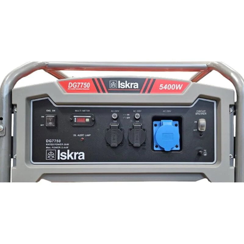 Iskra DG7750 bencinski agregat oblikuje 4-taktni bencinski motor s prostornino 420 cm³. Ponaša se z maksimalno izhodno močjo 5400 W in maksimalno zmogljivostjo motorja 9 kW. Zahvaljujoč premišljeni zasnovi agregat lahko deluje neprekinjeno do 9.5 ur s polnim rezervarjem (25 l). Električni tok znaša 22 A.
