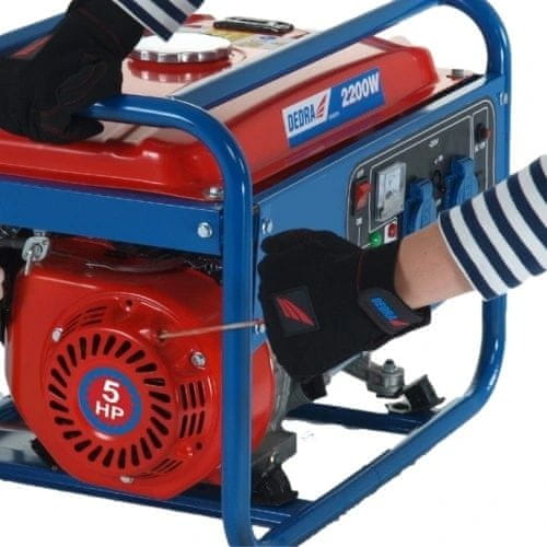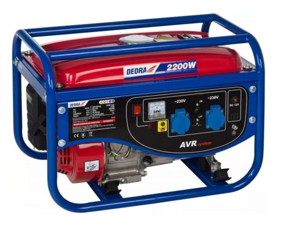 Generator moči 2200 W. Ta ponudba vključuje generator moči znamke Dedra z nazivno močjo 2000 W, ki ga poganja 4-taktni motor. Generator je izdelan iz zelo trpežnih materialov, kar zagotavlja dolgotrajno delovanje. Ima robustno ohišje in je odporen na težke pogoje. Zasnovan je kot zasilni vir napajanja 230 V v primeru izpada električne energije in vam omogoča proizvodnjo električne energije kjer koli. Generator ima trden standardni ročaj, ki omogoča enostaven transport. Idealen je za gospodinjstva, vrtove, kampe ali območja, kjer potekajo obnovitvena in gradbena dela. Prednosti: Popolnoma usklajeni parametri zagotavljajo odlično delovanje in enostavno uporabo. Odlikujejo ga trdna konstrukcija, velika moč in relativno nizka poraba goriva, kar je pomembna prednost. Vsestranskost je še ena od številnih prednosti tega generatorja. Idealen je za zasilno napajanje: doma, v pisarni, vozilu, v avtodomih, tovornjakih, traktorjih, avtomobilih, avtodomih, čolnih, jahtah in industrijski opremi. Parametri: Znamka: Dedra Tip: Enofazni Gorivo: Neosvinčeni bencin Zagon: Ročni Regulator napetosti: Elektronski AVR Nazivna moč: 2000 W Največja moč: 2200 W Vtičnice: 2 × 230 V Tip motorja: 4-taktni Prostornina motorja: 163 cm3 Omrežna frekvenca: 50 Hz Raven hrupa: 95 dB Prostornina rezervoarja za gorivo: 15 l Čas delovanja rezervoarja: 12 ur Teža: 34 kg Cena velja za en kos