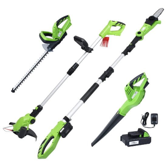 Ta vsestranski komplet vrtnega električnega orodja, ki vsebuje škarje za živo mejo, škarje za travo, pihalnik listja, višinsko žago, polnilnik in litij-ionsko baterijo 20 V 1500 mAh, vam omogoča enostavno opravljanje del na vrtu.