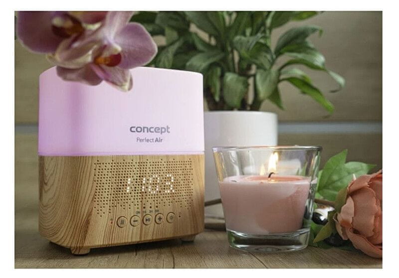 Aroma difuzor Light wood Concept DF2010 Perfect Air ponuja številne možnosti uporabe. Uporabljate ga lahko za aromaterapijo, kot vlažilec zraka, zvočnik Bluetooth ali budilko. Ima 300-mililitrsko posodo za vodo, ki zagotavlja do 10 ur neprekinjenega delovanja.