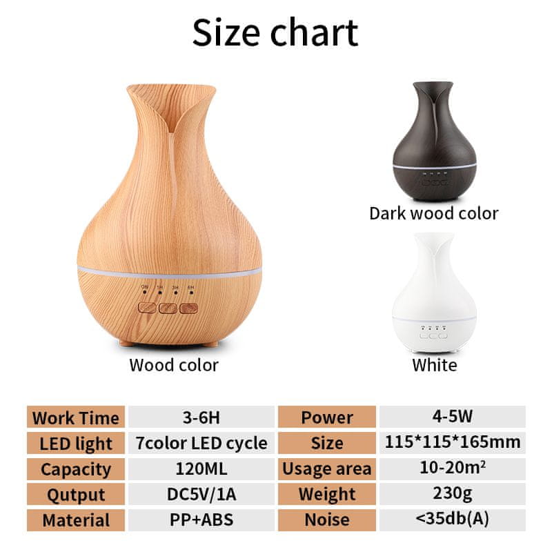 Uglasite svoj dom v vzdušje dobrega počutja in miru s tem čudovitim difuzorjem. Primerna je za aromaterapijo ali kromoterapijo (terapija s svetlobo). Vodo spremeni v fino paro. Če v vodo dodate nekaj kapljic eteričnega olja, jih bo aroma difuzor razbil na drobne mikro delce, ki bodo odišavili vaše stanovanje.