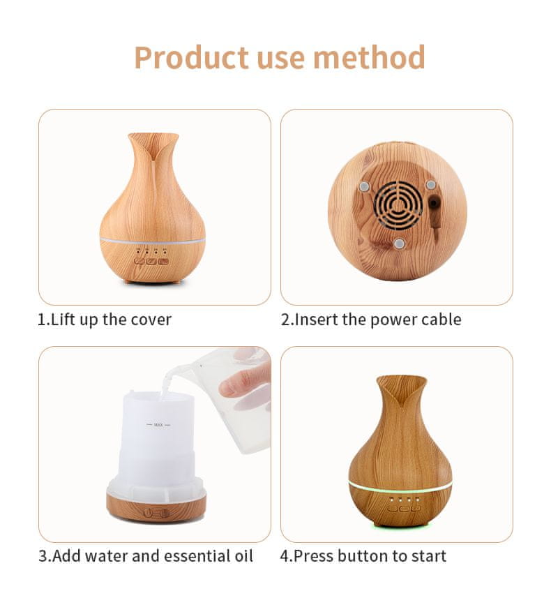 1. Klasičen lesni vzorec: Ta aromaterapevtski difuzor ni samo praktičen, ampak ima tudi eleganten dizajn. Difuzor je klasične lesene oblike. Še posebej je primeren za okrasitev dnevne sobe, spalnice, pisarne, hotela itd.
