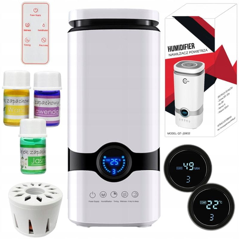 • SPECIFIKACIJA –  Bela barva; material: plastika; moč: 28W; obseg: 20m2; prostornina rezervoarja: 4l; učinkovitost: 300ml / h; ionizator: DA; higrostat: DA; časovnik: DA; plošča na dotik: DA; priložen daljinski upravljalnik: DA; nočni način: DA; sprememba jakosti pare: DA; način stalne vlažnosti: DA; olja v kompletu: 3; mere: 14/14/37 cm; teža: 0,950 kg