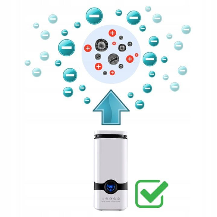• IONIZATOR  – zmanjša nam škodljive ione (pozitivne ione) s proizvodnjo negativnih ionov – vse onesnaženje pade na podlago, namesto da bi potovalo v naša pljuča; zrak postane lahek in svež , in tako? Naše razpoloženje se takoj izboljša! Ne počutimo se nenehno utrujeni, zaspani ipd.  Ionizator bo odlična rešitev predvsem za alergike, astmatike, pa tudi za ljudi, ki se pritožujejo zaradi stalnih glavobolov. Zrak, ki ga dihamo, je zelo škodljiv za naše zdravje, vpliva na celotno telo in je odgovoren za stanje naše kože, las in pljuč. Najbolj nevarno je vse, kar ni vidno s prostim očesom – prah in pršice, malokdo izmed nas ve, da so električni aparati (telefon, TV, računalnik, mikrovalovna pečica, pralni stroj in številni drugi) velik problem, pozitivni ioni proizvajajo zelo negativno vplivajo na naše telo, zato je tako pomembno, da sebi in svoji družini zagotovite varen in zdrav zrak, ki ga zagotavlja ionizator – na kvaliteto zunanjega zraka ne moremo vplivati, vendar lahko zrak, ki ga dihamo doma, v veliki meri spremeni vlažilec zraka z ionizacijsko funkcijo. Naprava ima tudi funkcijo aromaterapije.