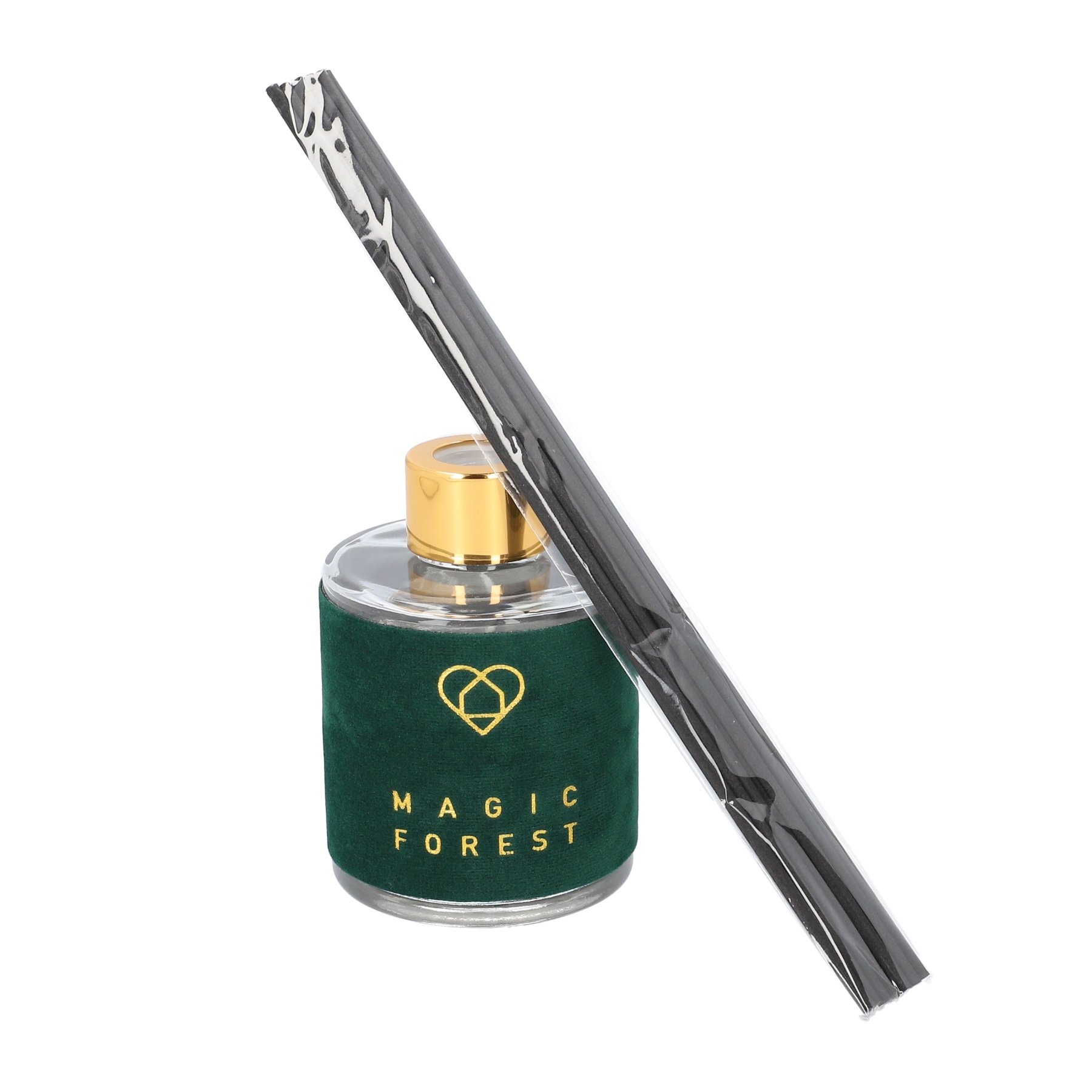 Difuzor ETERNAL Magic Forest je steklenička s prostornino 0,1 l, katere zunanjost je prekrita z materialom, ki spominja na temno zelen žamet. Komplet vsebuje tudi lesene palčke, skozi katere se aroma sprošča v zrak. Steklenička je sestavljena iz 95 % vode in 5 % dišave. Dišava traja 12 tednov.