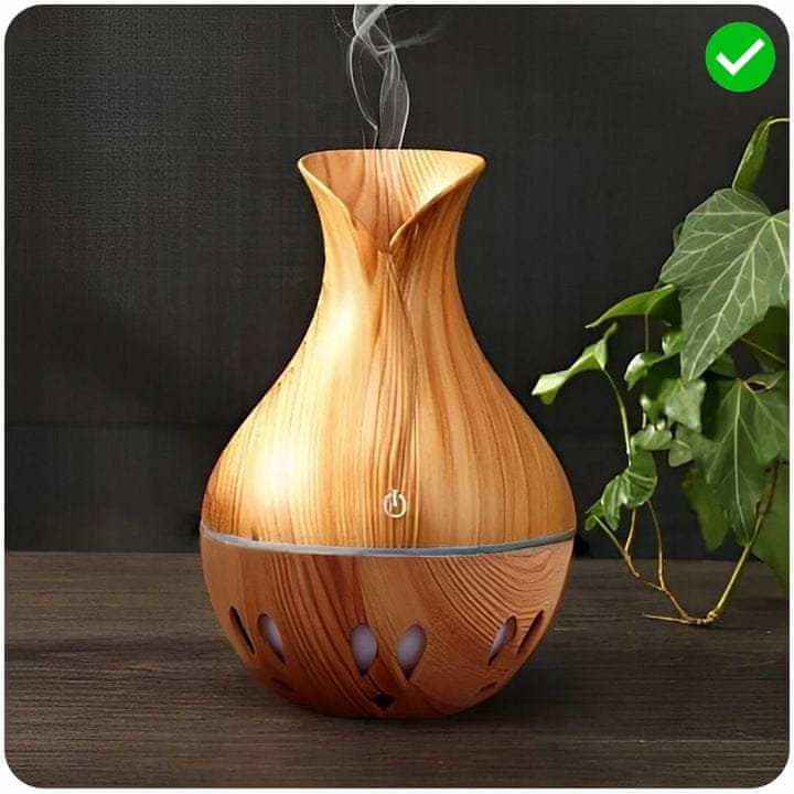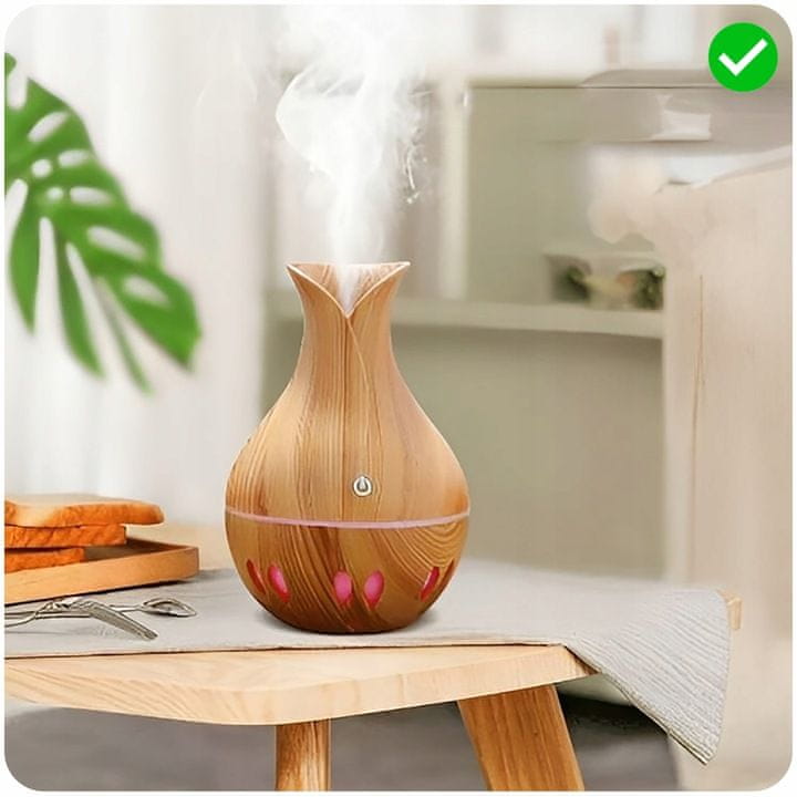 Popestrite svoj bivalni prostor z novim lesenim vlažilcem zraka. Uživajte v zdravstvenih prednostih zmanjšanega stresa in boljše sprostitve. Popoln za uporabo v kateri koli sobi. Povečajte izpust pare. Spremeni barve. USB napajanje. Stikalo za vklop/izklop. Osvežilno in vlažilno ozračje. Ta leseni vlažilec zraka ustvarja osvežujoče in vlažilno ozračje, ki pomaga zmanjšati onesnaženost zraka in vzdrževati raven vlažnosti ter zagotavlja udobno bivalno okolje. Sproščujoč lesen vlažilec zraka ne le osveži in navlaži zrak, ampak služi tudi kot aromaterapija. S prijetnimi vonjavami pomaga sprostiti duha in telo, lajšati stres, izboljšati počutje in spodbujati mir. Za bolj aromatično vzdušje lahko dodate dišave ali eterična olja. Tiho. Naprava deluje tiho, zato lahko ob njej mirno spite. Uživate lahko v miru in uživate v hladnem, osvežujočem zraku, ki ga zagotavlja. Dobro za vaše zdravje. Uporaba vlažilnika zraka v vašem prostoru lahko pomaga upočasniti rast bakterij, zaščititi vaše zdravje in vzdrževati ustrezno hidracijo kože. To je še posebej koristno za ljudi z alergijami, pogostimi prehladi, težavami z dihanjem ali zelo suho kožo. Lahko izboljša zdravje dihal, očisti sluznice in spodbuja zdravo okolje. LED luč z barvnimi možnostmi: osrednja LED luč ponuja 7 različnih barvnih možnosti, ki ustvarjajo prijetno in sproščujoče vzdušje. Njegov mehak sij ni presvetel, zato je primeren za uporabo ponoči brez pretirane motnje. Samodejni izklop: Ta naprava je zasnovana tako, da se samodejno izklopi, ko je nivo vode nizek, kar zagotavlja varno in energetsko učinkovito delovanje. USB povezljivost: Vlažilec lahko enostavno napolnite tako, da ga povežete z mobilnim telefonom ali računalnikom preko USB kabla. Tehnični podatki: Barva: Svetel les, Kapaciteta: 130 ml, Samodejni varnostni izklop, ko napravi zmanjka vode, Dimenzije: 15 × 10 cm