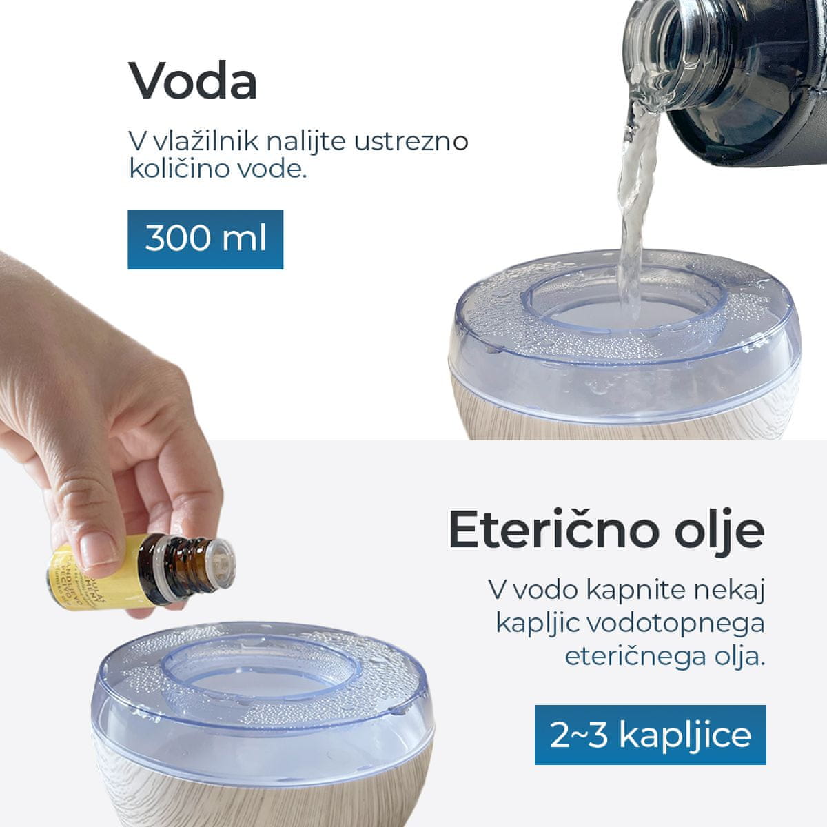 Odličen pripomoček za vaš dom! Najboljša rešitev za vlaženje suhega zraka! Zagotovite si čist in svež zrak, pomirite razpoloženje, izboljšajte kakovost spanca in uživajte v pomirjujočem vonju svoje najljubše dišave. Vlažilnik s pomočjo ultrazvočnih vibracij ustvarja ultra fino meglico, ki se razprši v zrak in tako povečuje vlažnost v prostoru. Vanj dodajte 2–3 kapljice eteričnega olja in se tako obenem znebite suhega zraka in uživajte v pomirjujoči aromi.