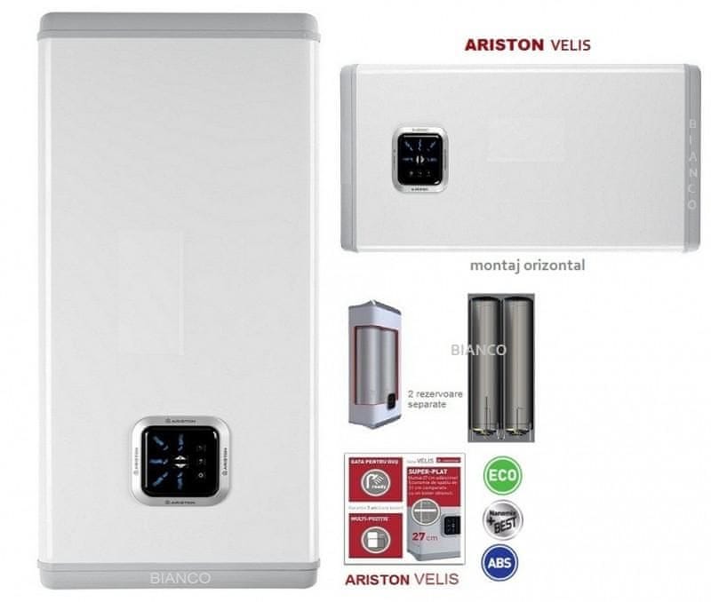 Grelnik vode Ariston Velis VLS omogoča pokončno ali vodoravno montažo, saj ima priključne cevi na levi strani. Kapaciteta grelnika je 50 l. Celoten opis