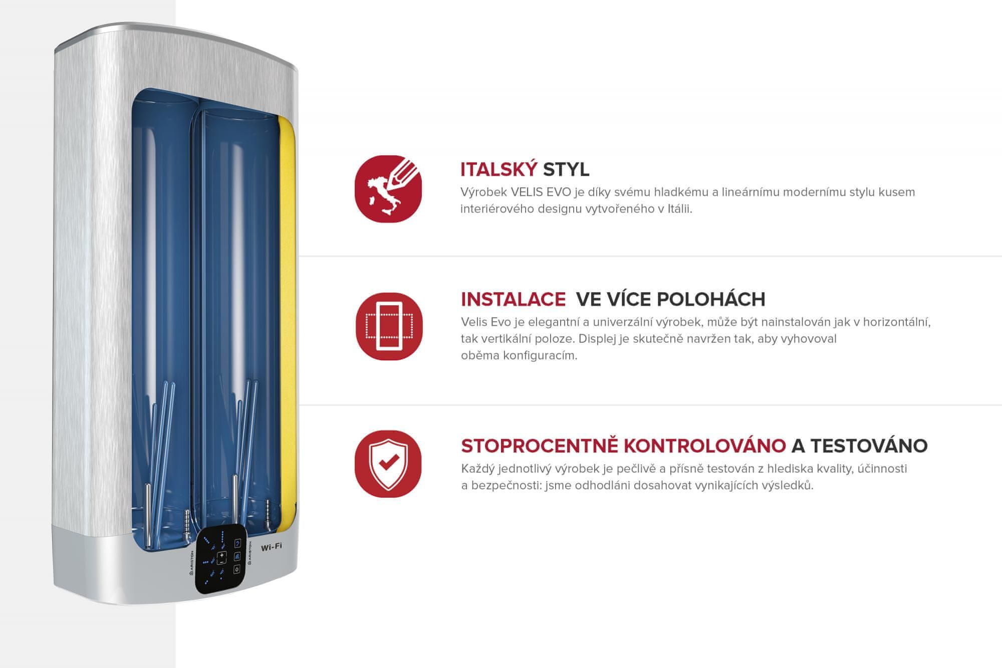 • Izdelek vsebuje celovit elektronski varnostni komplet, z vrsto napravami, ki zagotavljajo največjo varnost tako za uporabnika kot za izdelek, kar omogoča uporabo grelnika vode brez tveganja in zmanjšuje možnost okvare. Zahvaljujoč integrirani tehnologiji Wi-Fi in aplikaciji Aqua Ariston Net izdelek je mogoče upravljati tudi na daljavo.