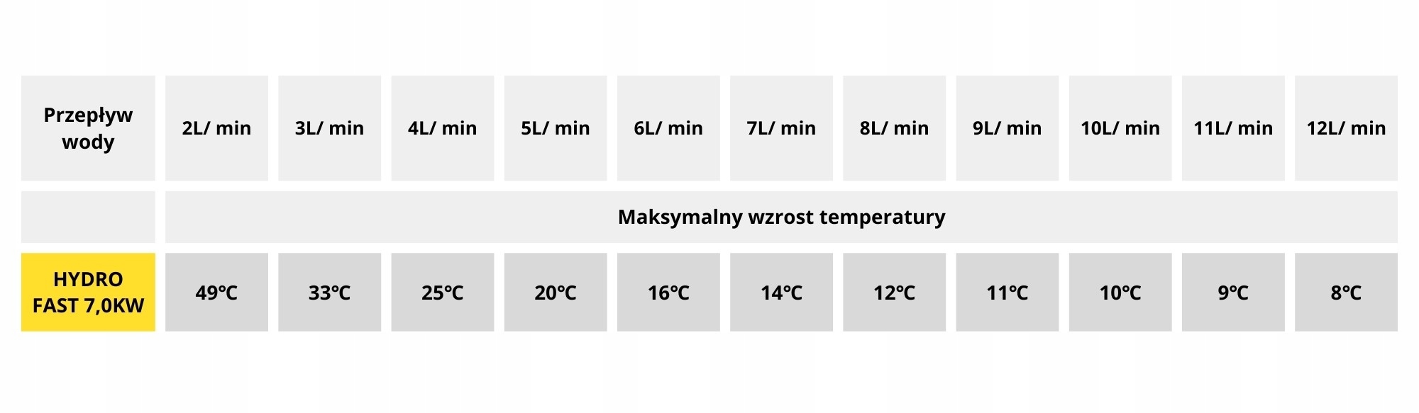 Grelniki serije HYDRO FAST imajo omejevalnik temperature vode pri 65 ℃ in zaščito grelnega elementa pred pregrevanjem 90 ℃ Učinkovitost grelnika je odvisna od nastavljenega pretoka vode. Višji kot je pretok vode, nižja je lahko učinkovitost naprave. Močnejši kot je izbrani model grelnika, manj opazen je ta pojav.
