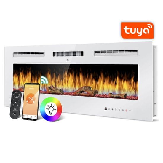 Z 9 barvnimi načini, 6 barvami plamena in 5 stopnjami svetlosti lahko videz kamina prilagodite svojemu razpoloženju ali slogu notranjosti. Elegantna steklena sprednja plošča daje kaminu sodoben videz in je enostavna za čiščenje. Upravljanje je zelo preprosto – uporabite lahko daljinski upravljalnik, zaslon LED na dotik ali mobilno aplikacijo Tuya Smart/Smart Life.