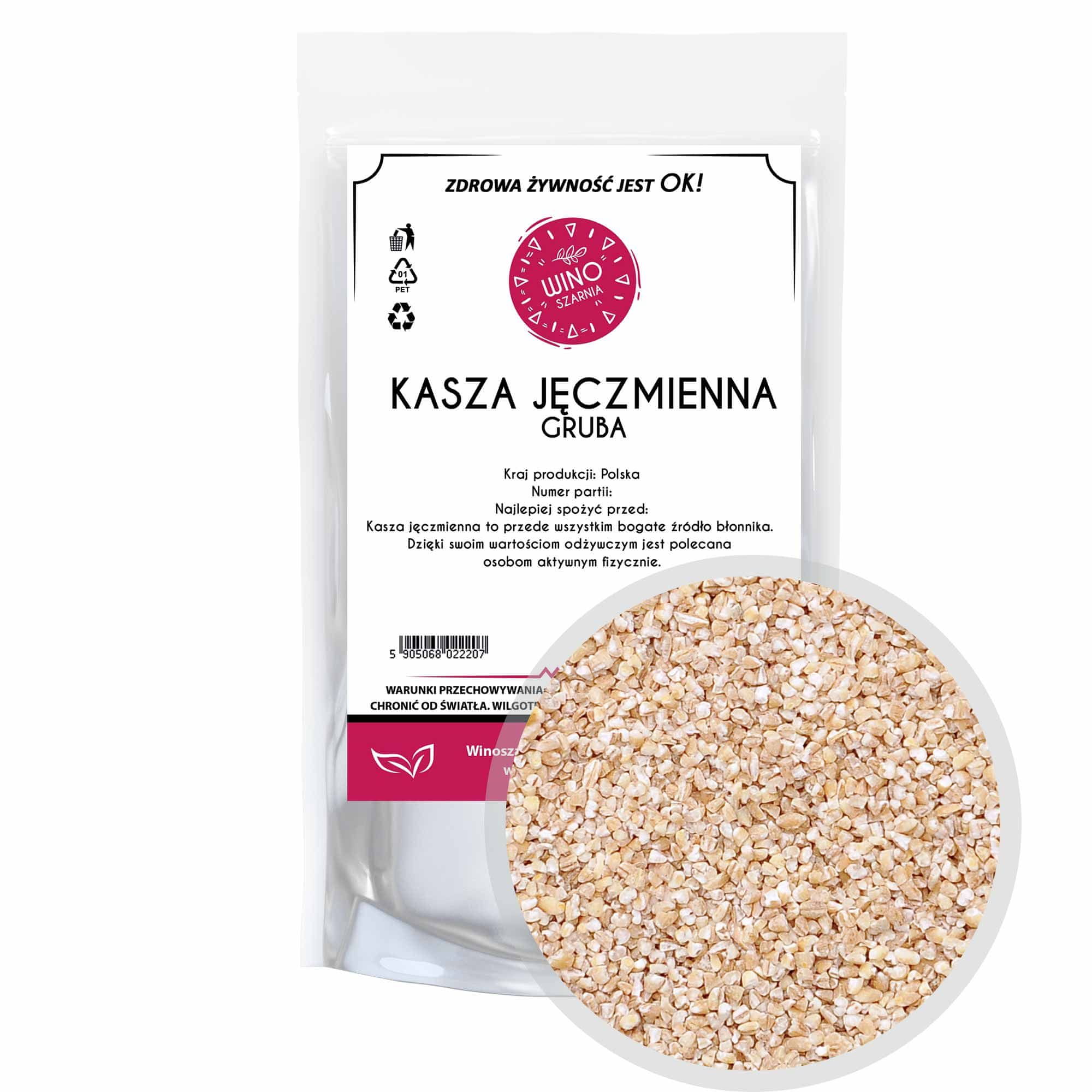 Groba podeželska ječmenova kaša Ječmenova kaša je predvsem bogat vir vlaknin. Zaradi svoje hranilne vrednosti je priporočljiva za telesno aktivne ljudi. Odlično se poda k mesnim jedem za večerjo, zaradi česar je idealen nadomestek za krompir ali testenine. Zanimivost: Ječmenova kaša predstavlja 70 % proizvodnje kaše in je proizvedena iz ječmenovega zrna. Parametri: Država porekla: Poljska Sestavine: podeželska ječmenova kaša Barva: svetlo siva Okus: značilen Aroma: značilna Alergeni: lahko vsebuje žita, ki vsebujejo gluten, orehe, mandlje, zeleno, volčji bob Embalaža: vrečka DOYPACK z zadrgo Hranilna vrednost na 100 g izdelka: Energijska vrednost: 1457 kJ / 348 kcal Maščobe: 2,2 g – vključno z maščobnimi kislinami. Nasičene maščobe: 0,4 g Ogljikovi hidrati: 75 g – vključno s sladkorji, od tega sladkorji: 0,5 g Vlaknine: 5,4 g Beljakovine: 6,9 g Sol: 0 g Naša ponudba vključuje: belo ajdovo kašo, praženo in opečeno ajdovo kašo, kuskus, ječmenovo kašo, biserno ječmenovo kašo, grobo ječmenovo kašo, proseno kašo, beli riž, riževe kosmiče, rjavi riž, ovsene kosmiče, gorske ovsene kosmiče, ržene kosmiče. Vrečka Doypack: Laserska perforacija. Lasersko perforirana linija skupaj z Easy Open omogoča enostavno odpiranje embalaže v ravni črti. Zadrga. Odpiranje z vrvico omogoča večkratno odpiranje in zapiranje embalaže. Funkcionalno zlasti za razsute izdelke. Easy Open. Zareza za enostavno odpiranje.