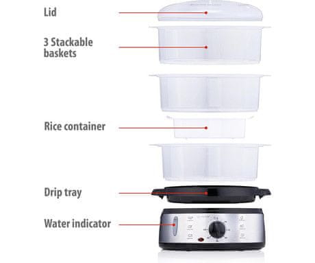 • CEL OBROK – V 3 priloženih posodah je hkrati skupna prostornina 9 litrov. To vam omogoča, da s parnim kuhalnikom hkrati skuhate cel obrok.
