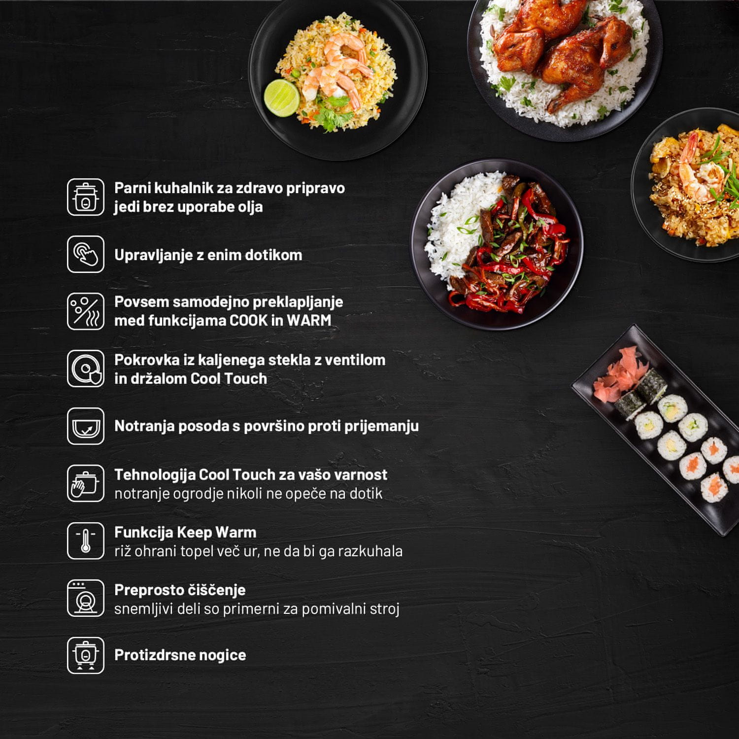 - Samodejna funkcija Keep Warm ohranja riž topel, ne da bi zavrel